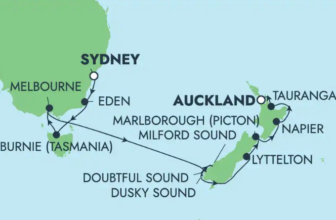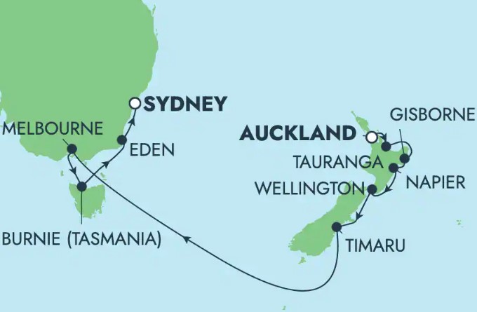 Plecati intr-o croaziera de neuitat de 12 zile de la Sydney la Auckland, explorand minunile pitoresti ale Australiei si Noii Zeelande. In Eden, cufundati-va in bogata istorie a vanatorii de balene si porniti intr-o aventura palpitanta de observare a faunei de coasta. Experientati diningul de clasa mondiala si linistitele Gradini Botanice Regale din Melbourne inainte de a continua calatoria. In Lyttleton, explorati fascinantul Muzeu Canterbury sau gustati din viata pe cel mai rece continent la Centrul Antarctic. In cele din urma, Tauranga va cheama cu minunile geotermale din Rotorua, unde gheizerele si izvoarele termale incanta atmosfera.