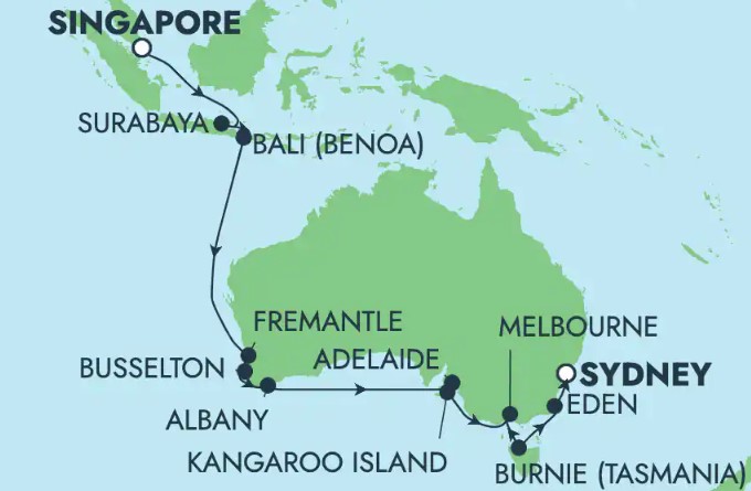 O calatorie care porneste din Singapore, continuand spre exoticul Bali si ajungand in Benoa – o insula insorita, cu plaje idilice de nisip alb si negru strajuit de apele turcoaz, avand ca fundal munti ondulati si paduri presarate cu cascade. Apoi, in timpul sederii tale in Fremantle, viziteaza unul dintre muzee sau exploreaza inchisoarea Fremantle – o atractie culturala de top – sau calatoreste spre plajele de pe Insula Rottnest, unde adorabilii si prietenosii quokka te asteapta sa te salute. Apoi, viziteaza buticurile locale din Adelaide pentru opalele celebre ale regiunii, bucura-te de vederi panoramice in timpul unei plimbari pe acoperisul Adelaide Oval sau viziteaza Centrul National al Vinului pentru a invata despre (si a degusta) viile din sudul Australiei. Melbourne ofera un amestec ideal de oras vibrant inconjurat de peisaje extraordinare si o fauna abundenta – unde te poti rasfata cu gastronomie rafinata si vinarii locale sau poti petrece timp cu adorabilii koala si canguri.